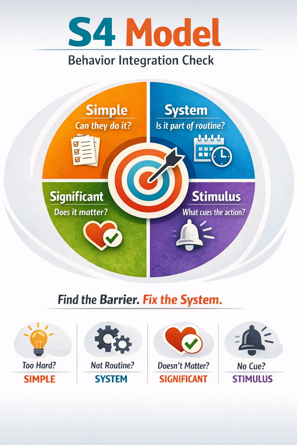 ⚡ Rule of Thumb: If the behavior isn’t happening, one or more of the 4 S’s is misaligned. (adjust the system, not the expectation)